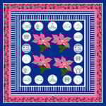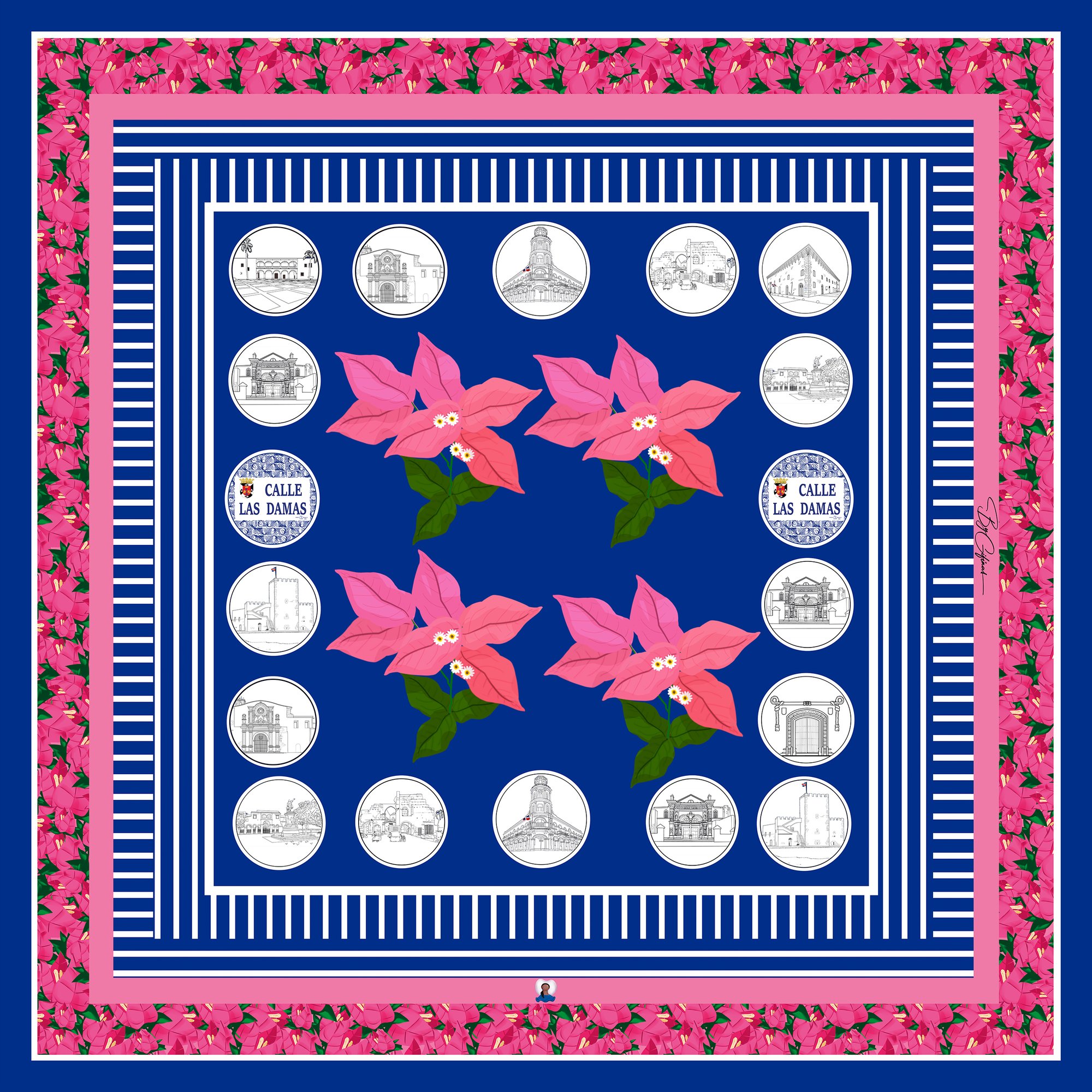 The palette is led by a deep colonial blue, a tribute to the Caribbean sky and sea that embrace the island. Around it, the ever-present bougainvillea blossoms—known locally as trinitarias—bloom across the design, just as they adorn the balconies and courtyards of the Colonial City. Their vivid colors and flowing forms bring energy and movement to the scarf, celebrating the living beauty that defines Santo Domingo’s streets.
