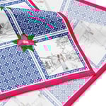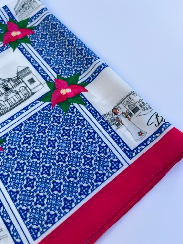 Inspired by the colors, textures, and iconic landmarks of Santo Domingo’s Colonial City, the “Mosaic of La Zona” scarf transforms Dominican heritage into a wearable work of art. Its design features illustrations of emblematic sites such as the Catedral Primada, the Ozama Fortress, the National Pantheon, and other historic spaces, arranged like fragments of a grand urban mosaic.