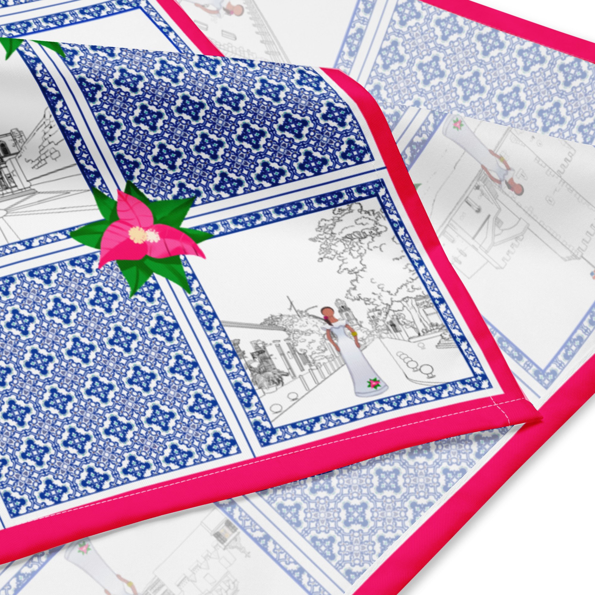 Classic patterns and Caribbean elements—like tropical flowers and the faceless doll, a Dominican cultural icon—are woven into an elegant and contemporary composition.