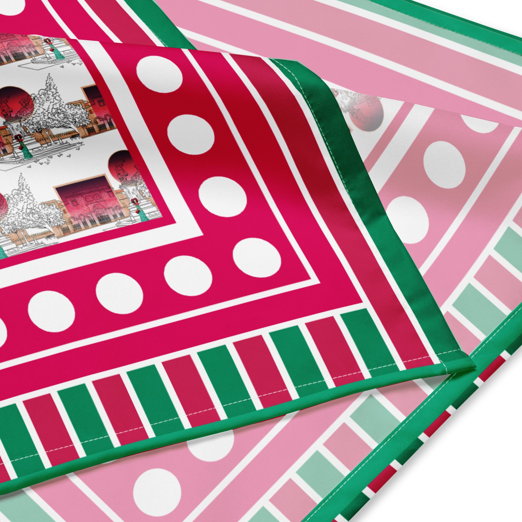Inspired by Santo Domingo’s iconic Parque Colón, this scarf features a bold mix of dots and stripes in vibrant red and green tones — echoing the rhythm and energy of the Colonial City.