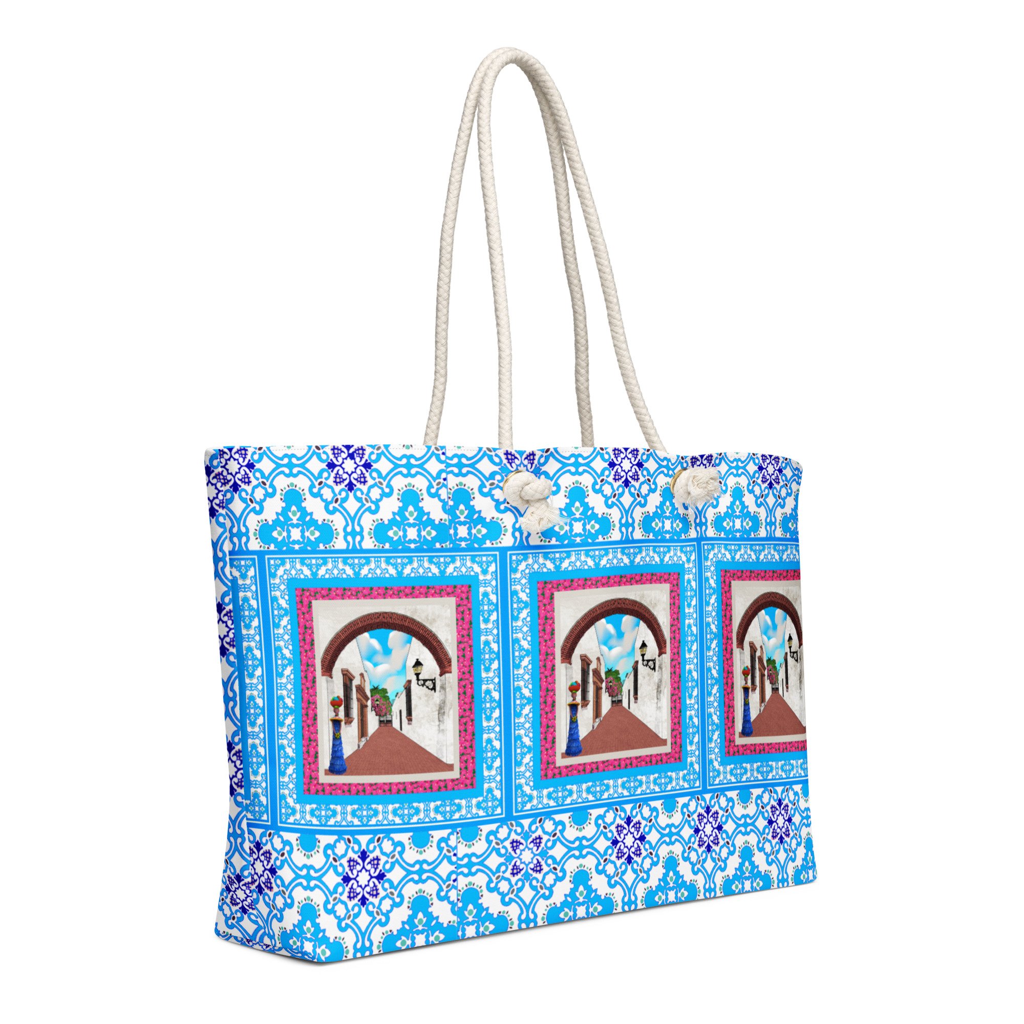 • Cream-colored cotton rope handles through metal grommets